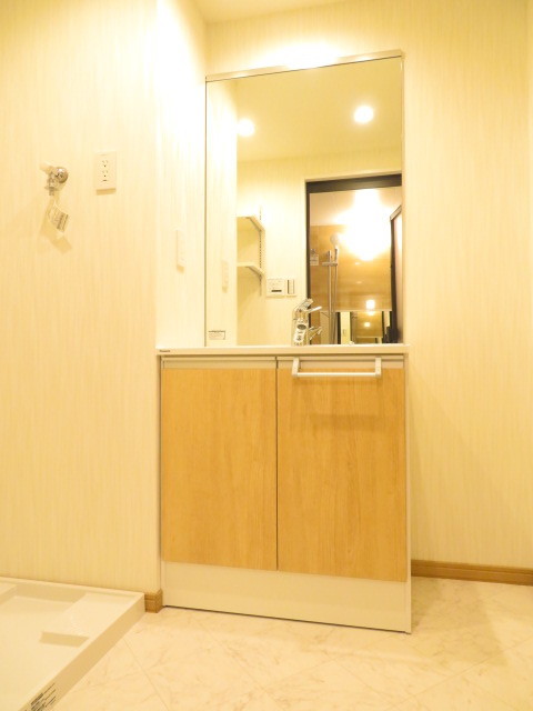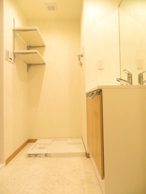 棚や小物を置くスペースもついているので、シャンプーなどを置くのに便利ですね。