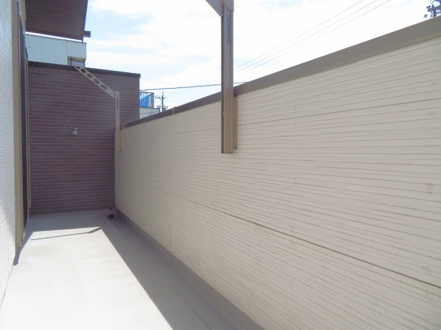 吹き抜けの階段には、上部にカーテンレールが取り付けられています。