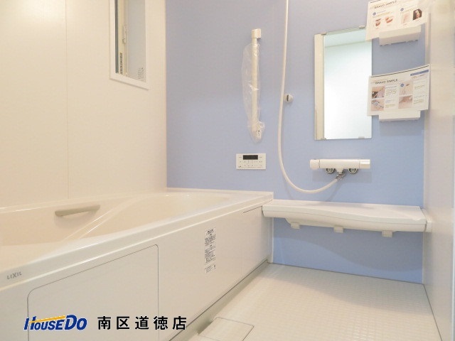 サックスブリルーの壁色で、清潔感のある爽やかな印象の浴室♪