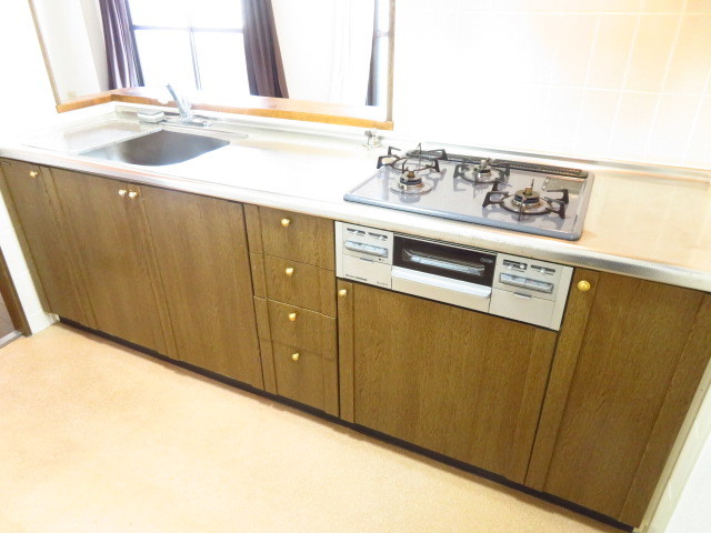 大きな鍋も洗いやすい、奥行きたっぷりのステンレスシンク。使い勝手が良いガスの3つ口コンロです。