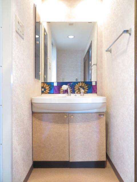 大きな鏡で朝の身支度も楽々♪洗面台横に収納と、タオル掛けも備え付けられています。