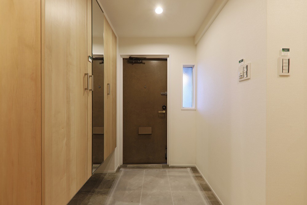 玄関収納には全身が映る鏡が付いているので、コートを着てカバンを持ち、靴を履いた状態でのトータルチェックが出来ますね♪