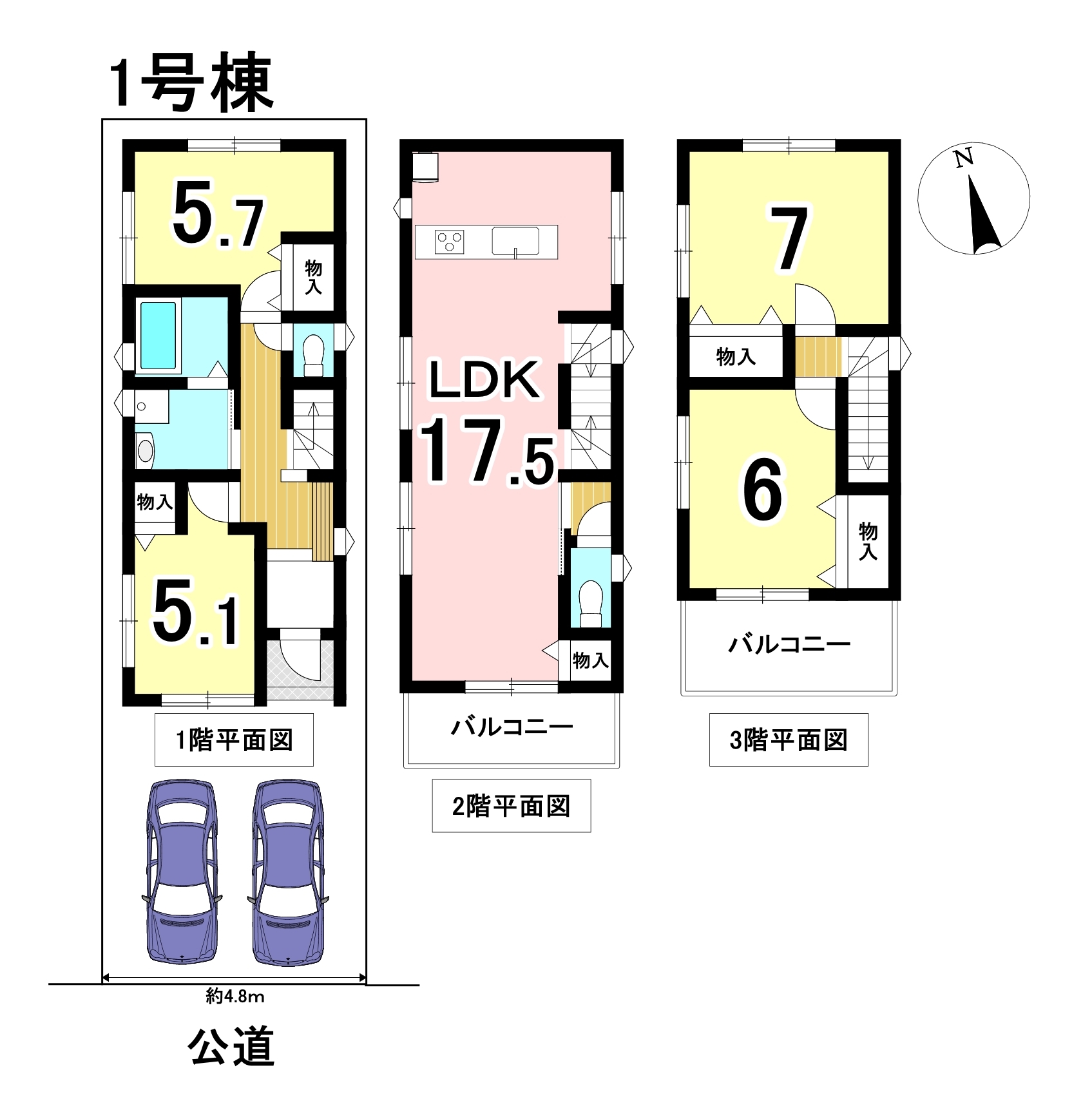 4LDKの間取り、駐車は2台可能な3階建ての住まい。