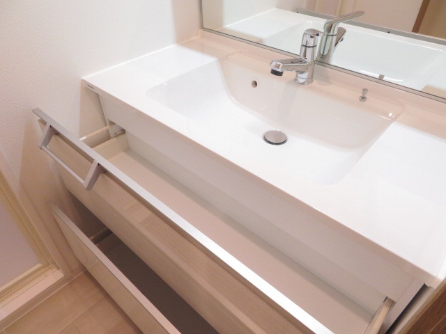 洗面台の下は、引き出し式収納もあるので、タオルのストックやお化粧品も収納できます。