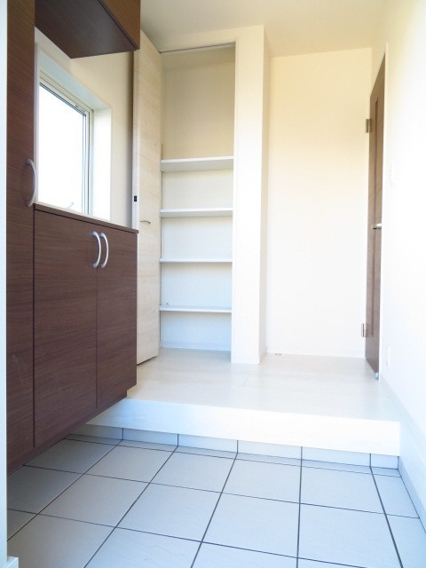 玄関正面には、高さの調節できる収納棚が完備されています。