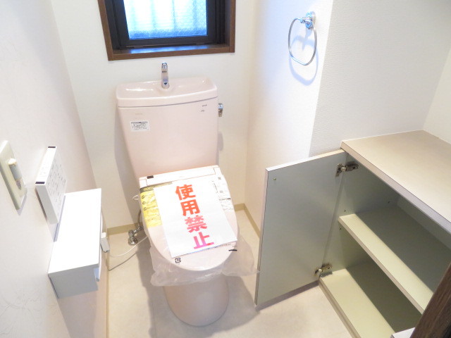 上下に収納棚が完備され、掃除道具やトイレットペーパーのストックも置いておくことができます。