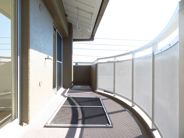 南側バルコニー:2面を繋ぐバルコニーはゆったりと、洗濯物も気持ちよく干せそうですね。