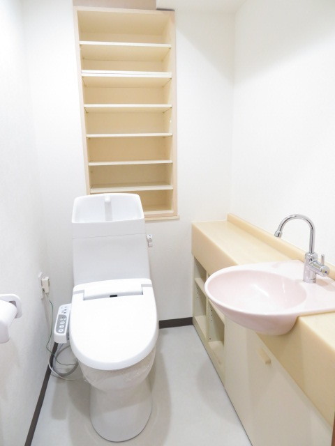 収納棚や手洗い水栓が付いたオシャレなトイレ♪