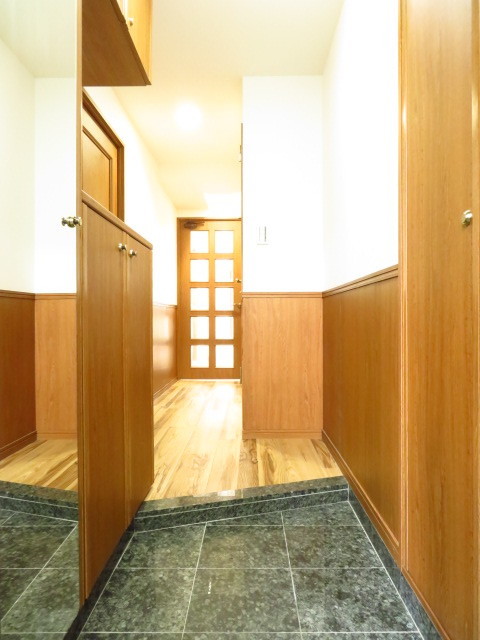 大理石調の玄関タイルに木目の建具で、高級感のある落ち着いた印象の玄関です。