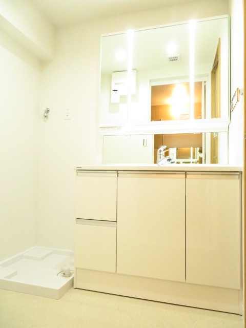 大きな3面鏡の洗面化粧台で朝の身支度も楽々♪ライト付きの鏡でお化粧にも◎