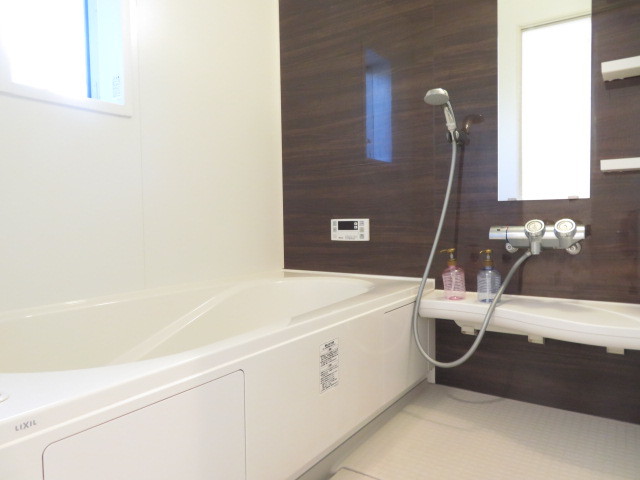 壁の色に変化をつけているので、明るさを保ちつつも落ち着いた印象の浴室です。西面に小窓が付いて、換気することができます。