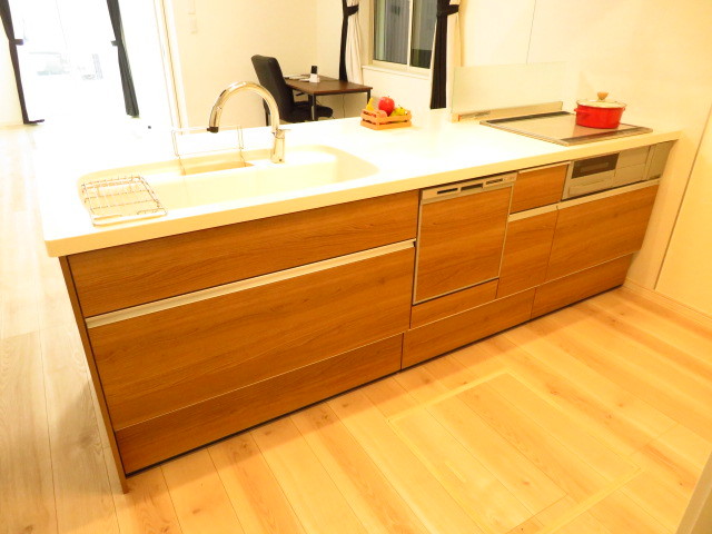キッチンには柱や上部に収納を設けていないので、リビングと繋がりのある開放的な空間です。使い勝手の良い、食洗機にIHクッキングヒーターを搭載!床下収納も完備されています。