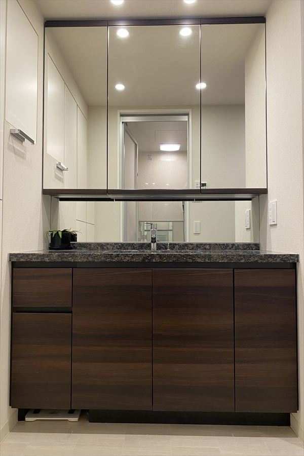 スタイリッシュなデザインの洗面化粧台。収納もしっかりついていますので、洗剤やシャンプーなどのストックもできます。大きな鏡で朝の身支度も楽々♪