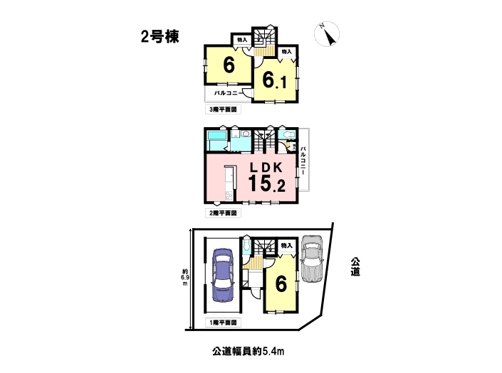 幅員約5.4mの南側前面道路です。車がすれ違うのに安心な道幅です。