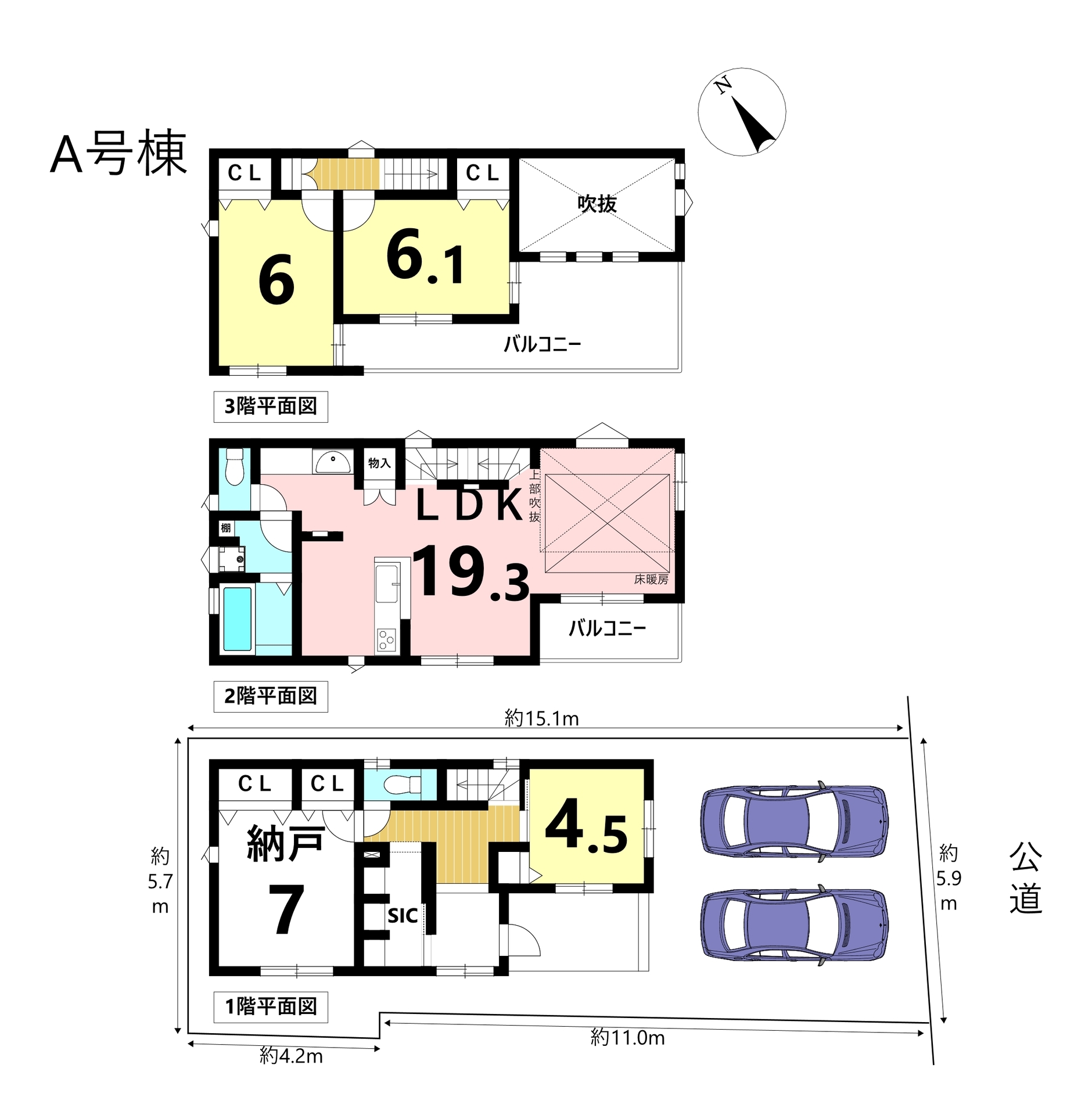 3LDK+納戸の間取り、駐車は2台可能な3階建ての住まい。