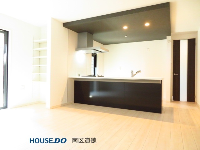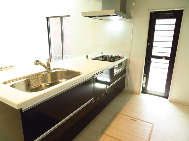 対面なのでリビングを見渡せる落ち着いた色合いのキッチンです。