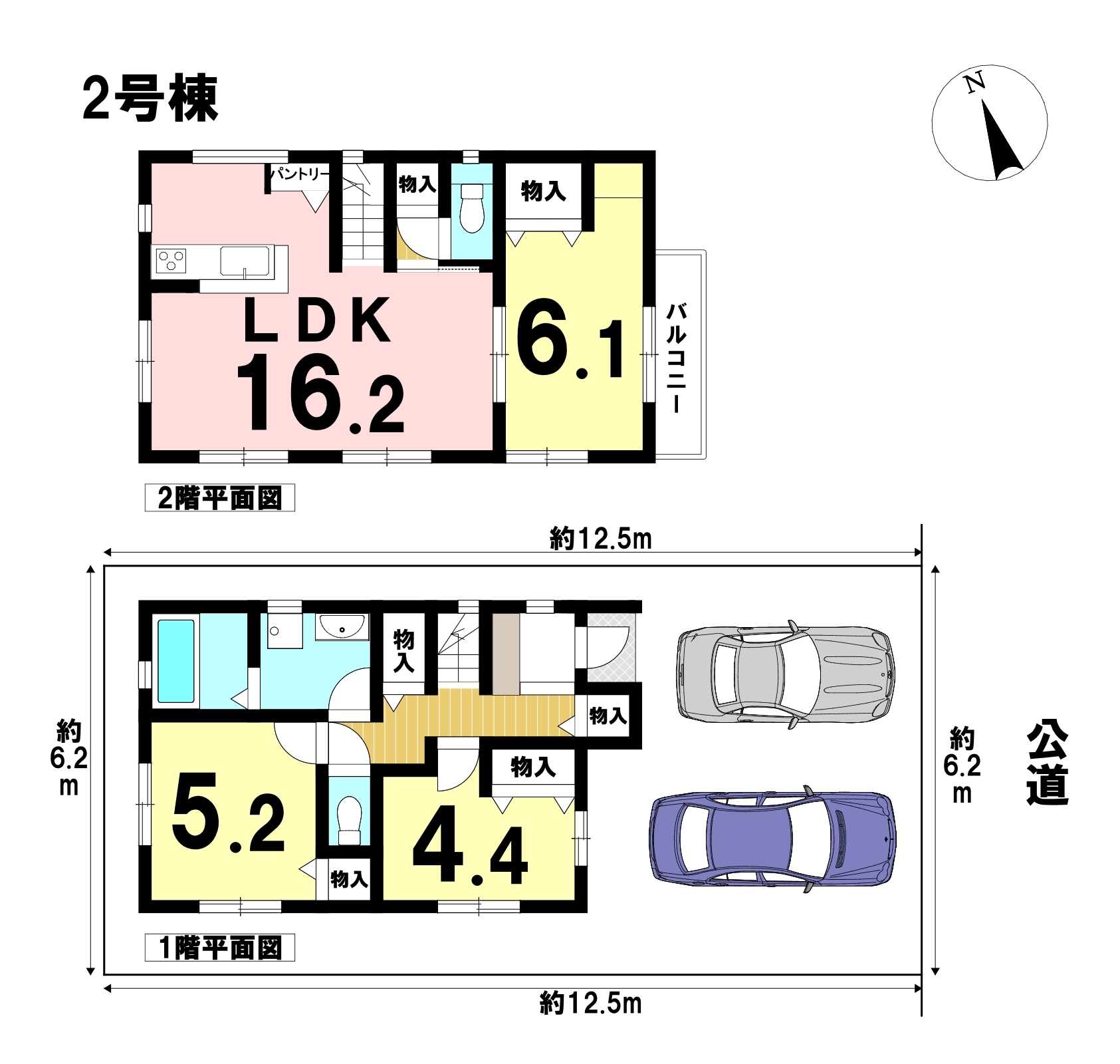 2号棟は、写真右側にあたります。吹き抜けのある2階にリビングを配置した住まい。