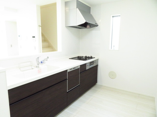 濃い色のシステムキッチンで、メリハリのある空間。料理をしながらリビングがしっかり見渡せます。