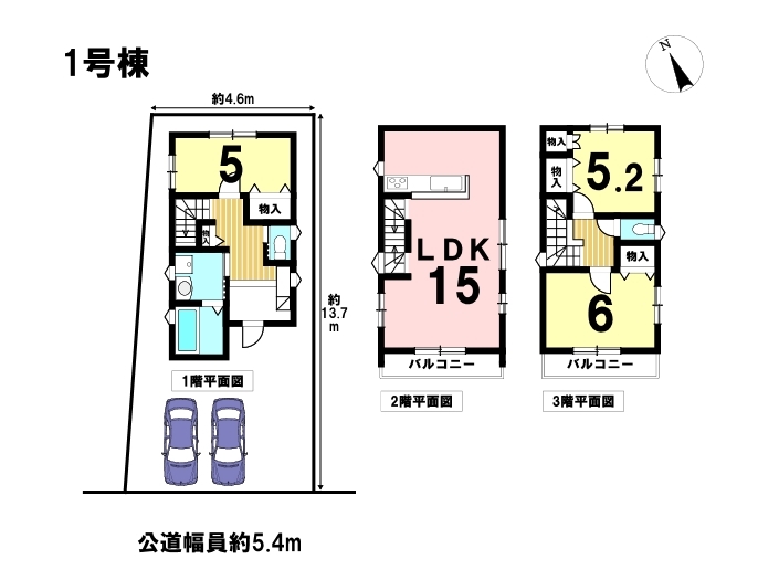 南向きの3LDK、駐車2台可能な3階建てのお家です。