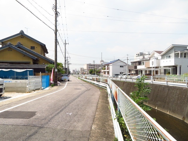 道路沿いは、このような水路が流れています。フェンスが付いていますので通行も安心です。