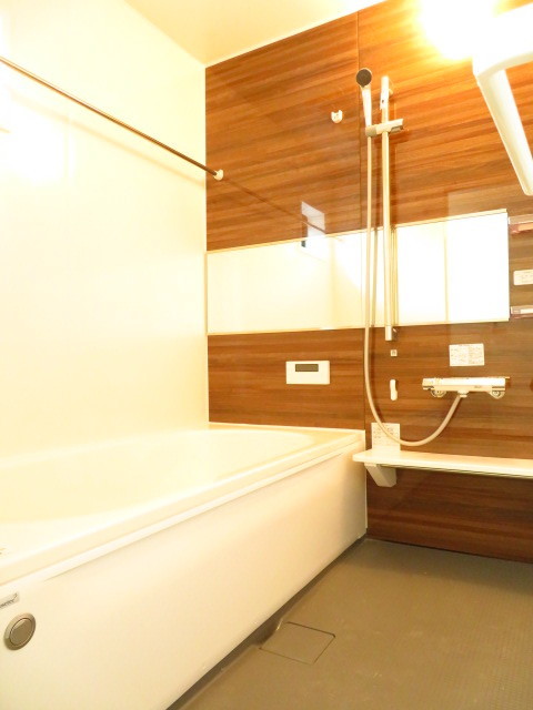 木目調の壁が落ち着いた印象を与えてくれる浴室です。