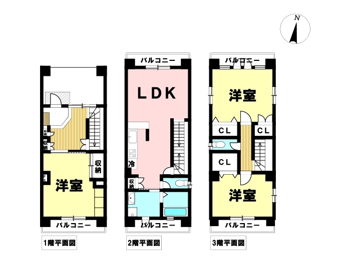 全部屋バルコニー付きで明るく、風通しも良好な、3LDKの間取り、駐車は1台可能な3階建ての住まいです。