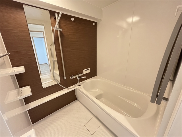 ホワイトを基調とした浴室です。シンプルなデザインなので、お掃除がしやすくキレイを保ちやすくなっています。