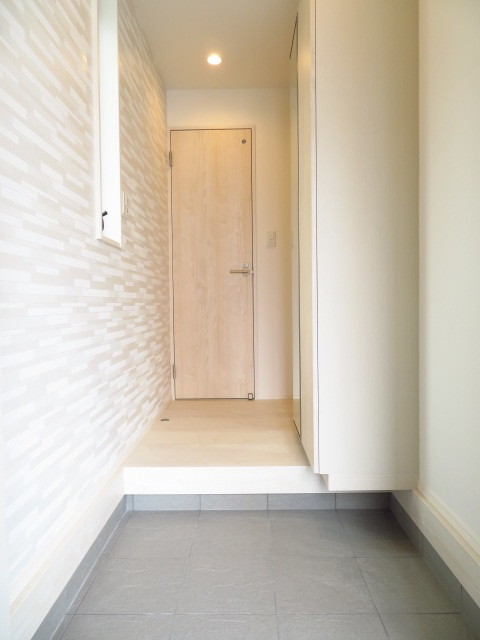 北向きの玄関は、壁紙にアクセントクロスが施され、