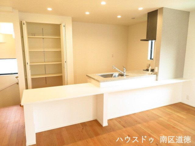 キッチンのカウンター下は空間があるので、棚を置いたり、収納スペースにするのも良いですね◎キッチンにはパントリーが付いています♪