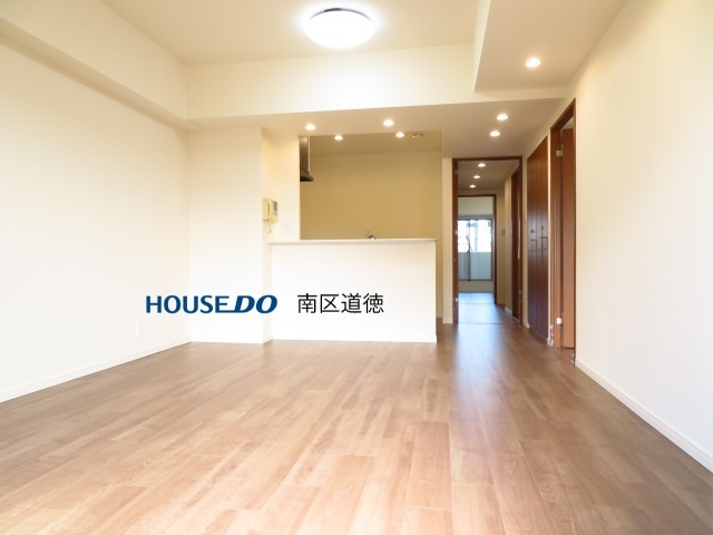 落ち着いたお色のフローリングとダウンライトで、洗練されたデザインのリビング空間。