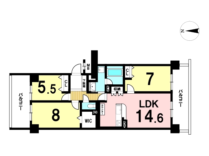 WIC付き8帖洋室:全居室バルコニー付きで、