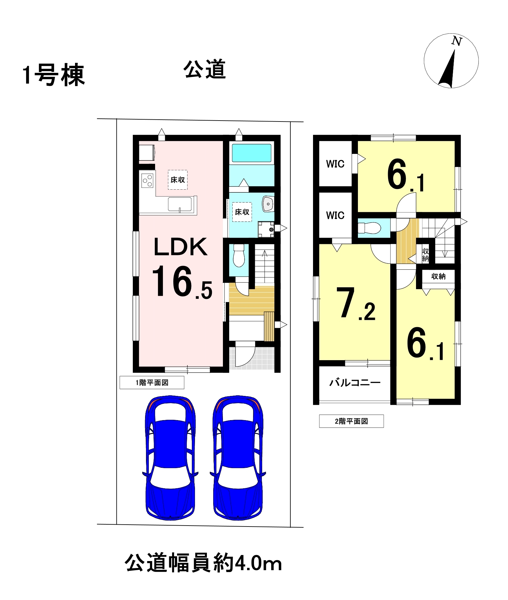 南側と北側の2面の道路に面しています。3LDKの間取り、駐車は2台可能。