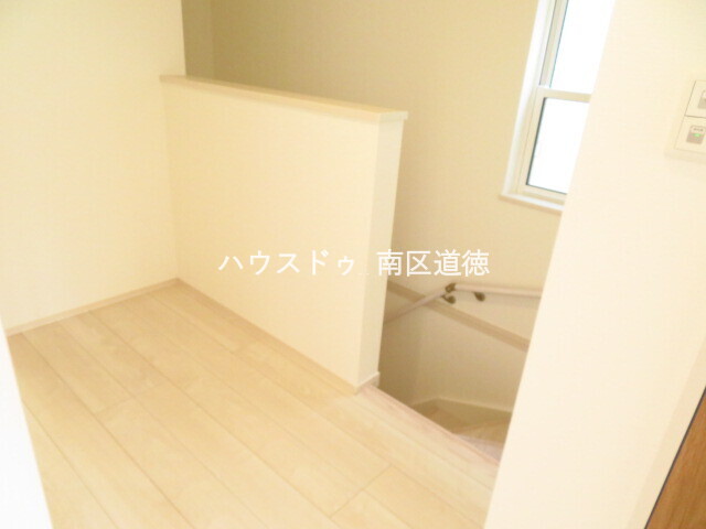 2階廊下:階段スペースには東面に小窓が付いて自然光が入ります。
