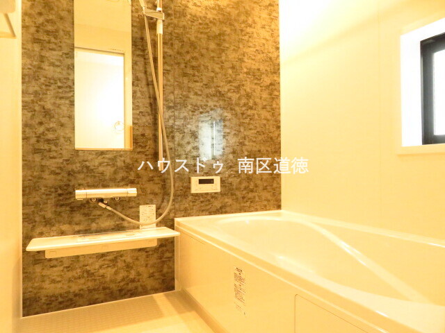 壁の色に変化をつけているので、明るさを保ちつつも落ち着いた印象の浴室です。浴室暖房乾燥機を標準装備!節水タイプの保温浴槽!