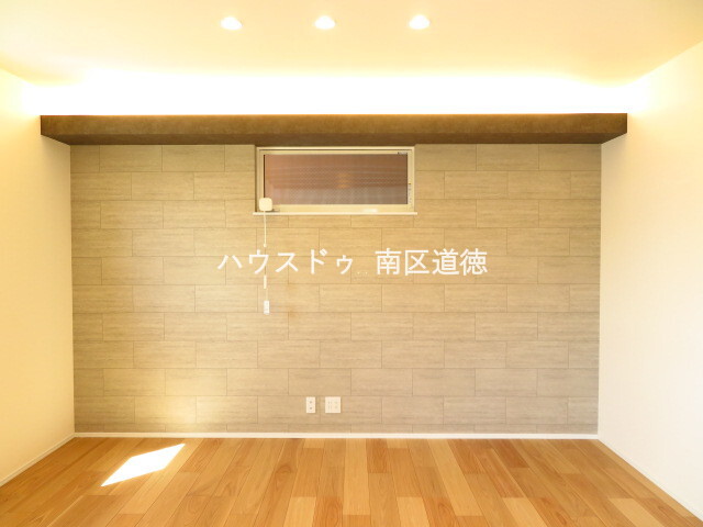 西面はアクセントクロスが施されています。上部に棚が設けられ、インテリアをオシャレに演出してくれます。