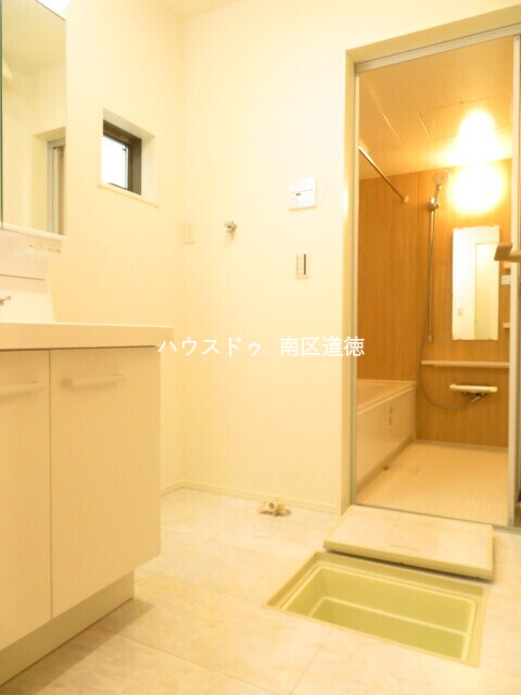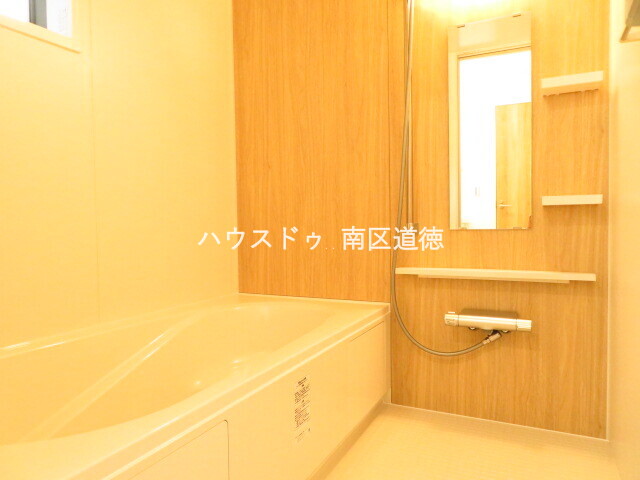木目調の壁が落ち着いた印象を与えてくれる浴室です。