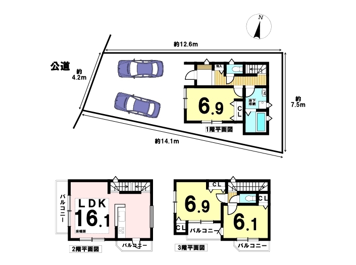 3LDKの間取り、駐車は2台可能な3階建てのお家。