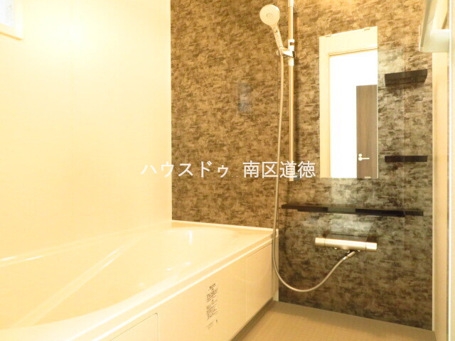 壁の色に変化をつけているので、明るさを保ちつつも落ち着いた印象の浴室です。