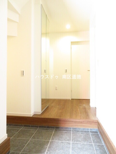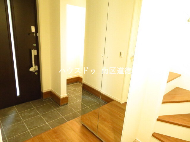 ワンタッチで開く玄関収納の扉は、全面鏡張りとなっています。
