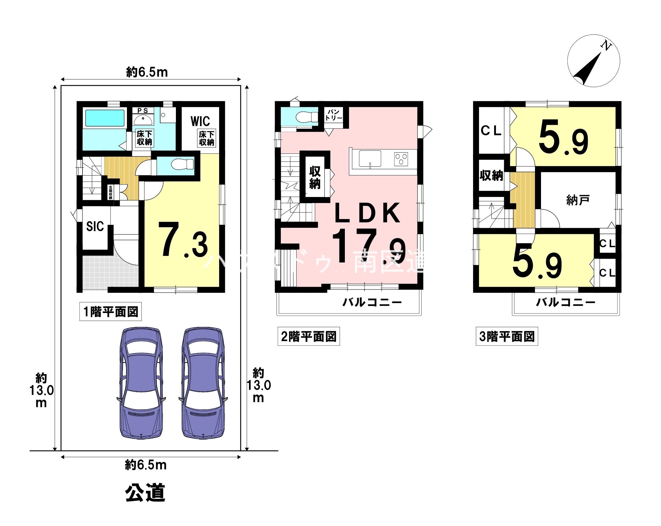 3LDK+S(納戸)の間取り、駐車は並列2台可能な3階建てのお家。
