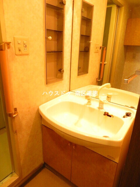 大きなミラーが付いた洗面化粧台です。扱いやすいシャワー付き水栓。壁に備え付けられた棚が魅力です♪