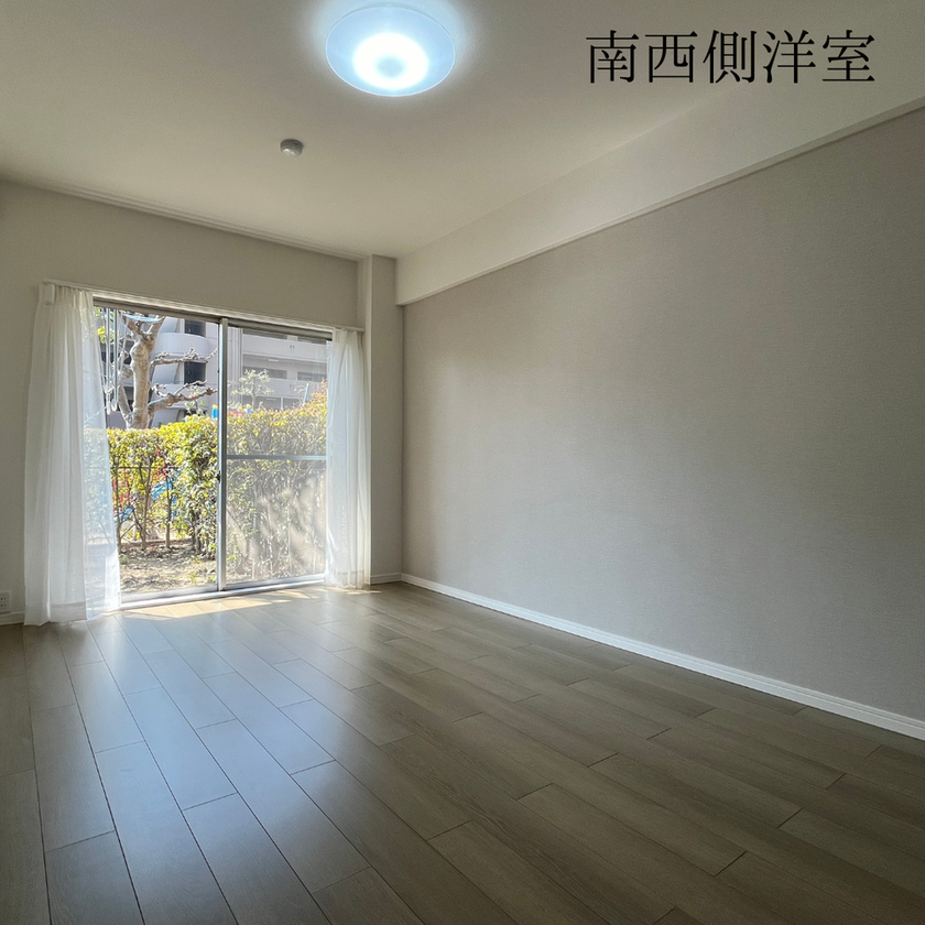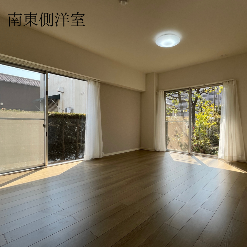 南東側洋室:南庭に繋がる洋室です。東面の窓からもお庭に出入りができ、開放的で外でも楽しめるお部屋です♪