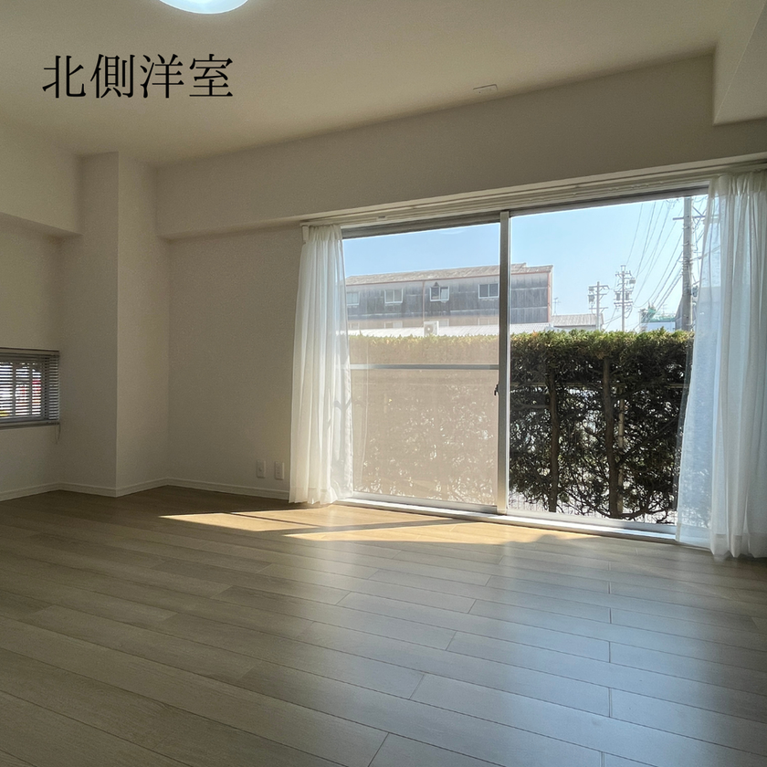 北側洋室:こちらのお部屋からも東面のお庭に出入りができます。暗くなりがちな北側の洋室ですが明るい空間です。