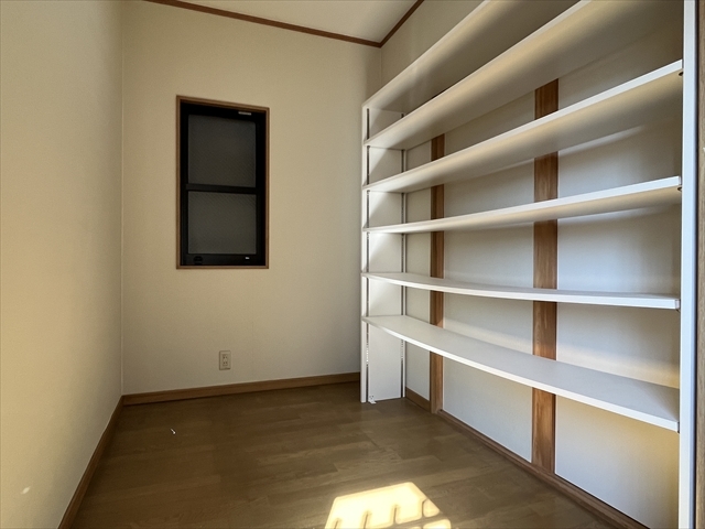 1階納戸:3階納戸に比べるとコンパクトですが大きな可動棚があることで非常食などのストックも出来そうです。