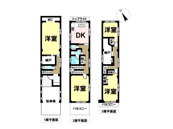 4DK+2S(納戸)の間取り、3階建ての住まいです。