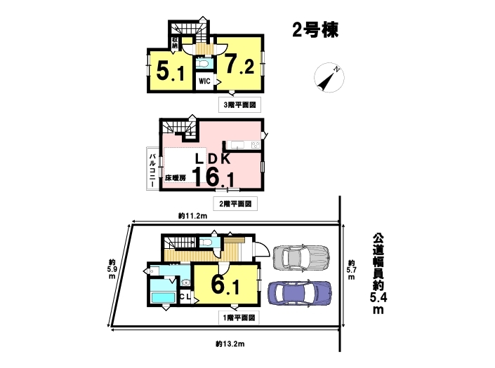 3LDKの間取り、駐車は2台可能な3階建てのお家です。