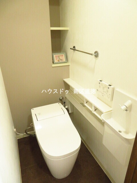 手洗いに、収納棚も完備され機能的でオシャレなトイレです。