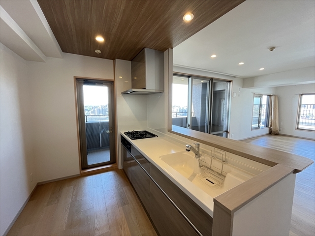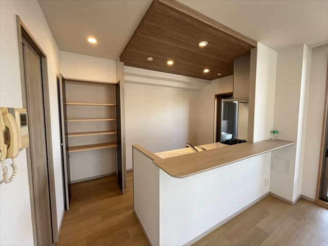 木目の折り下げ天井で、あたたかく優しい雰囲気のキッチン♪
