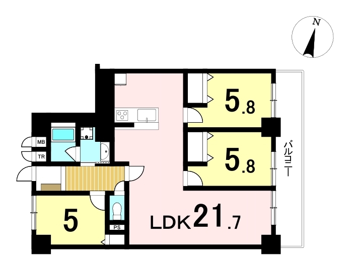 5.8帖中央洋室:南向きで過ごしやすいお部屋です。