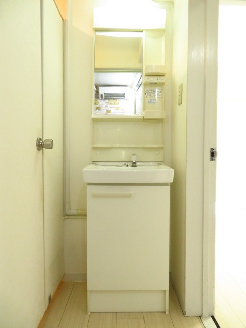 廊下から繋がる洗面スペースです。洗面台の下は、収納スペースが付いていますので、洗剤やシャンプーなどのストックもできます。